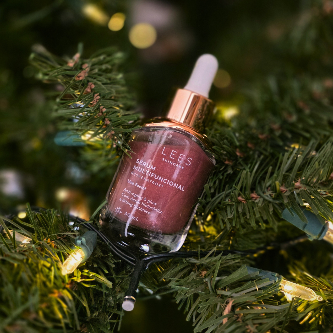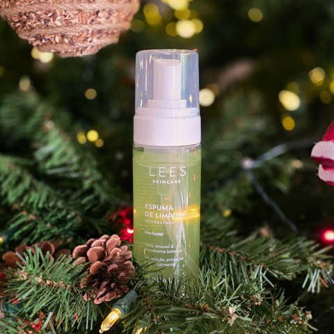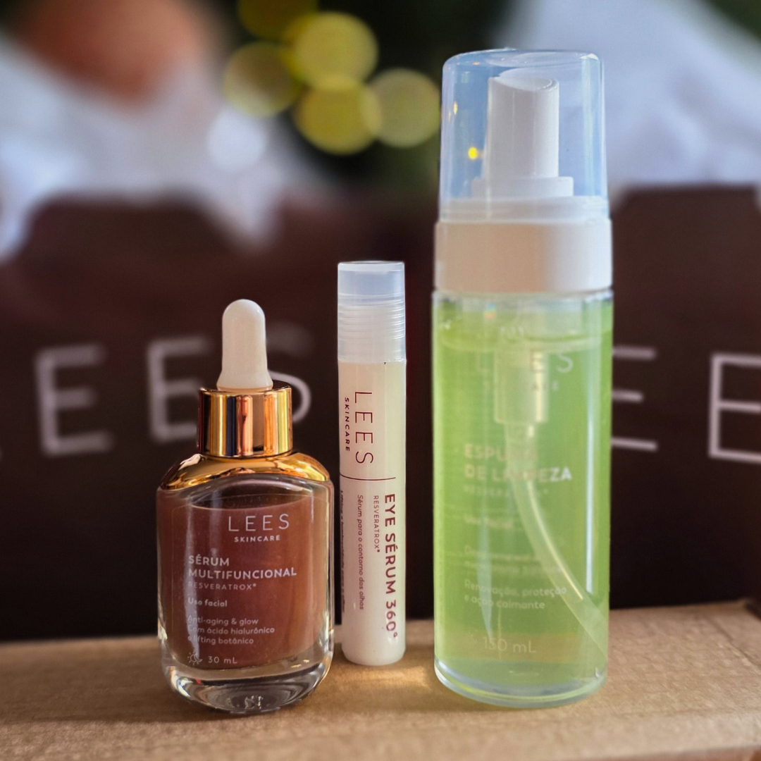 O Trio de Natal reúne os três passos essenciais da rotina LEES: limpeza sensorial, tratamento multifuncional e cuidado completo para a região dos olhos.